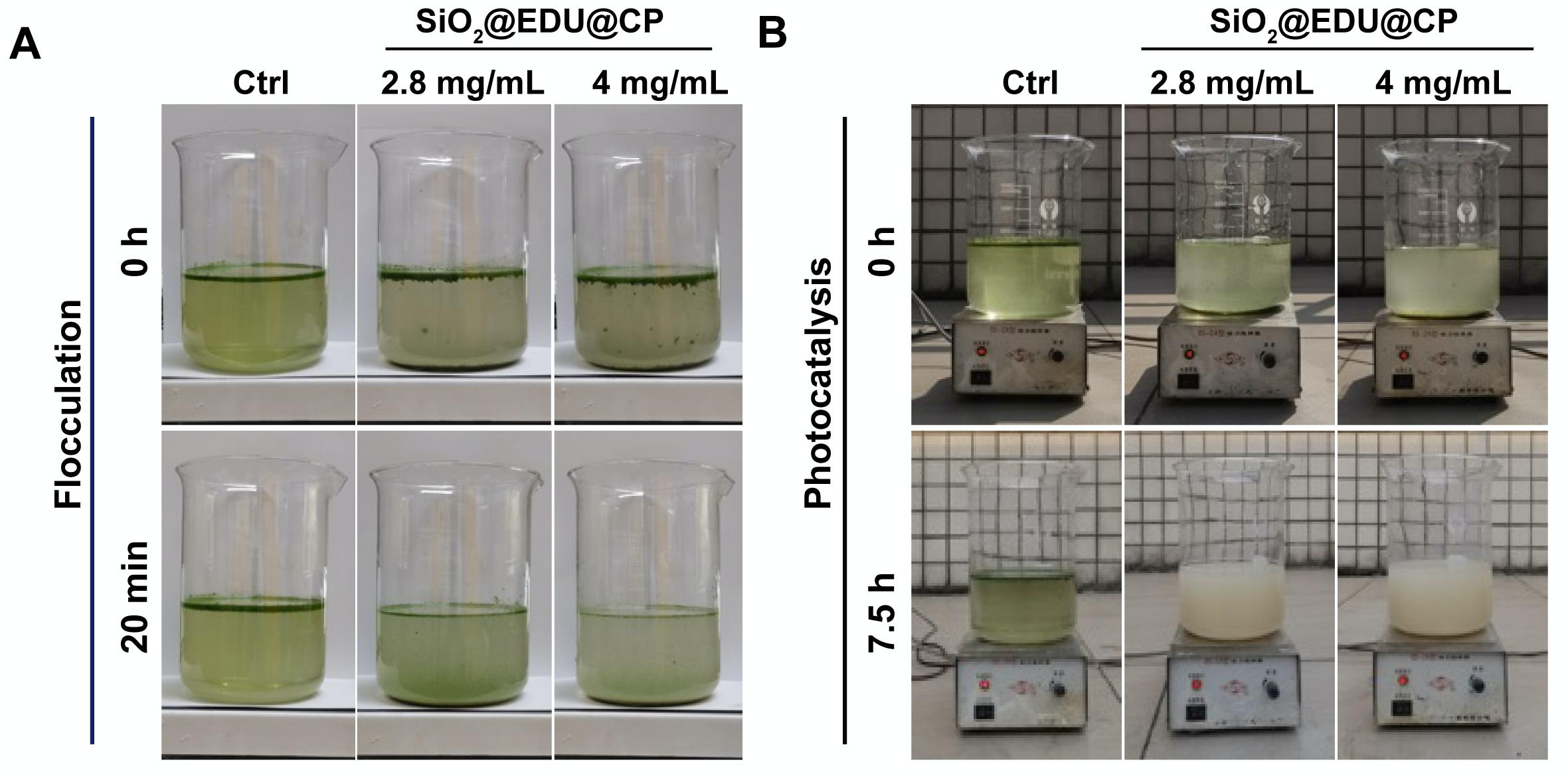 值得一提的是,该方法在抑制蓝藻的过程中,还对蓝藻自身产生的毒素(铜绿微囊藻毒素)和异味物质β-环柠檬醛具有降解活性,展现了该复合材料良好的降解多功能性。在实际应用中,仅需7.5小时SiO2@EDU@CP即可在室外太阳光的照射下有效抑制实际太湖蓝藻的生长,使太湖蓝藻的绿色明显消退,抑藻率高达95%,进一步证明了该方法的实用价值。