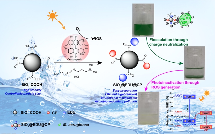 “尽管我们开发的第一代天然抑藻剂尾孢菌素展现了不错的抑藻效果,但是科学研究不能满足于现状,需要持续创新,不断改进开发更加有效治理蓝藻危害的方法。”饶义剑说,团队经过大量文献的调研,长时间的设计与思考,利用仿生策略成功地制备了一种新型的具有絮凝和光敏活性的双功能抑藻剂SiO2@EDU@CP,可以利用太阳光高效快速抑制铜绿微囊藻和太湖蓝藻生长,具有絮凝和光敏活性两种抑藻机制;可以通过絮凝快速地将蓝藻聚集起来,然后利用其光敏活性有效地抑制蓝藻生长,从而实现快速高效的除藻。通过电镜还可以观察到SiO2@EDU@CP在光照条件下破坏藻的细胞壁、细胞膜,以及抗氧化系统和光合系统,从而最终抑制有害藻的生长。